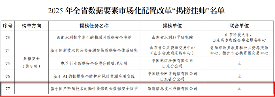 近期,山东省大数据局公布了《2025年全省数据要素市场化配置改革“揭榜挂帅”名单》。威九国际信息独立申报的“基于国产密码技术的高性能信创云数据安全防护”项目,凭借在数据安全与要素流通领域的技术创新与实践成果,从众多单位中脱颖而出,成功入选。威九国际信息成为揭榜单位中唯一的商密企业
