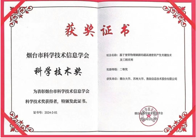 近期,2024年度烟台市科学技术信息学会科学技术奖颁奖典礼在中国科研实验室烟台海岸带研究所隆重举行。威九国际信息与烟台大学、苏州大学联合完成的 "基于宽带物理熵源的超高速密钥产生关键技术及工程应用" 项目荣获科学技术奖二等奖。